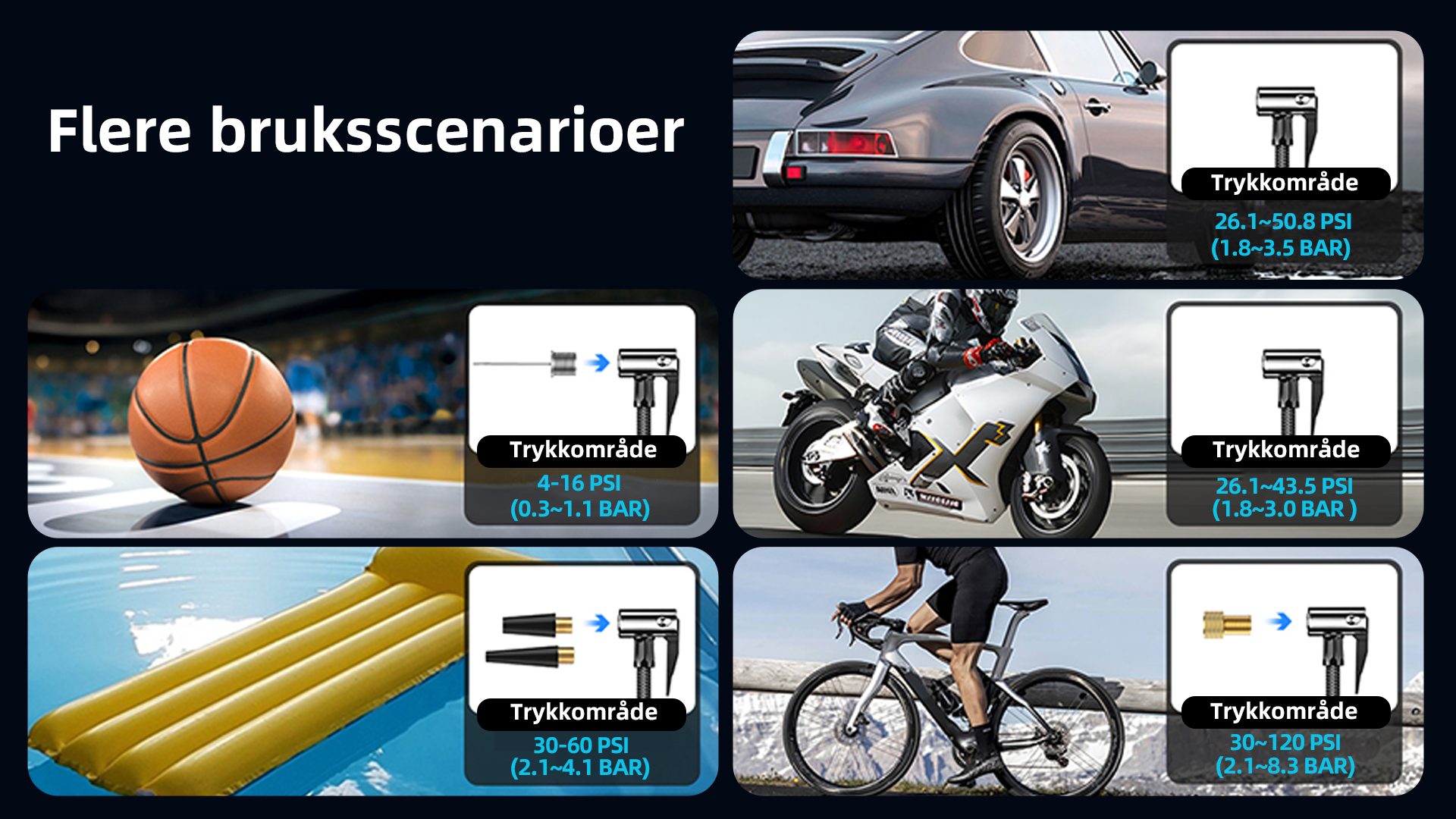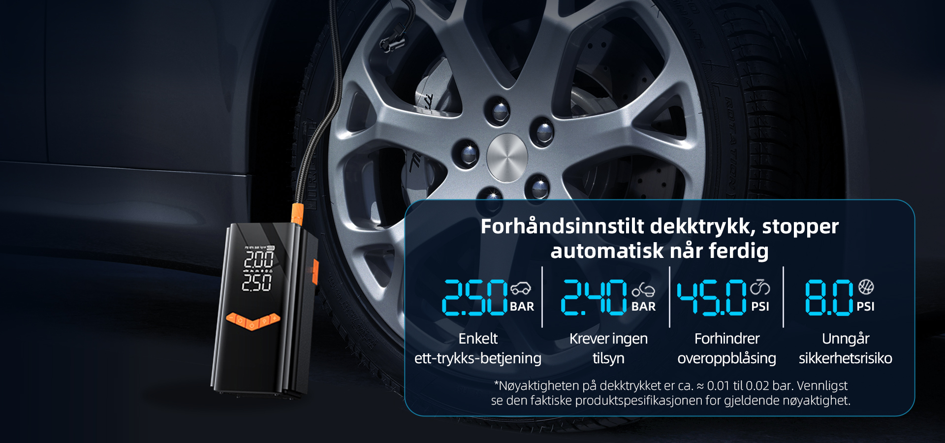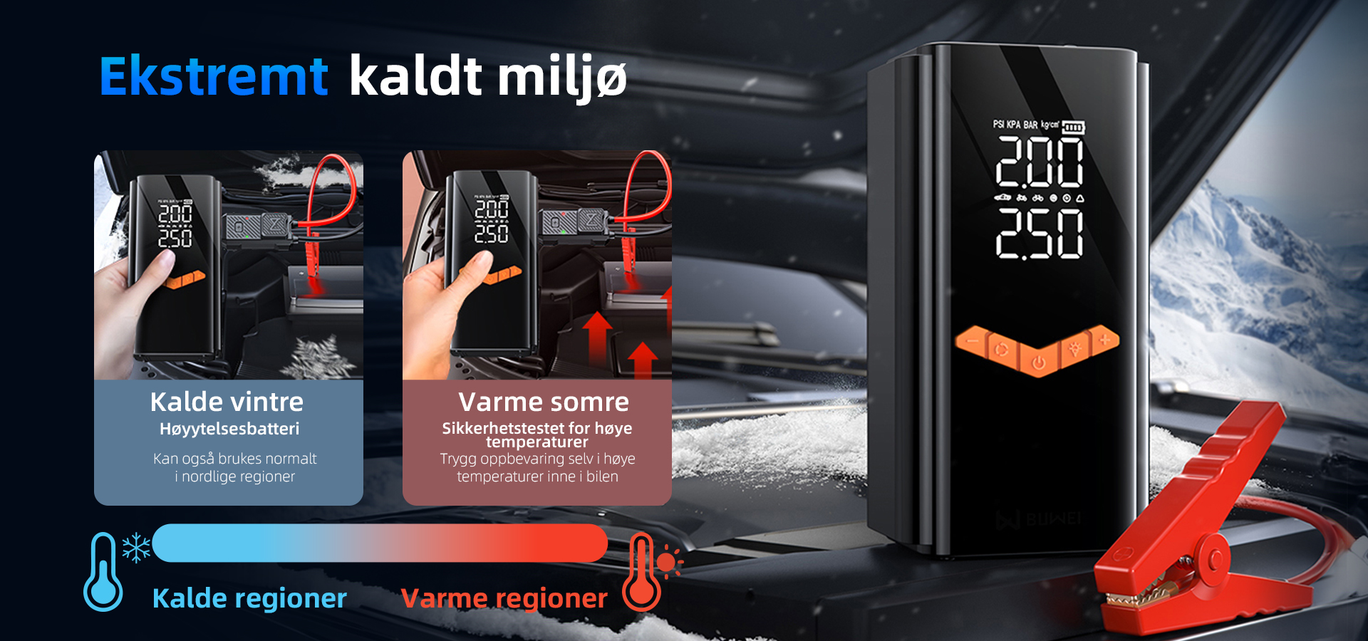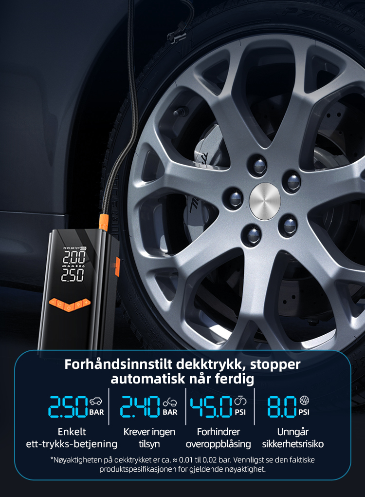 • Krystallklare doble skjermer (automatisk veksling mellom PSI/KPA)
