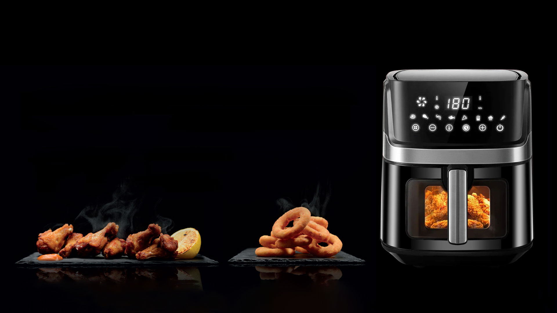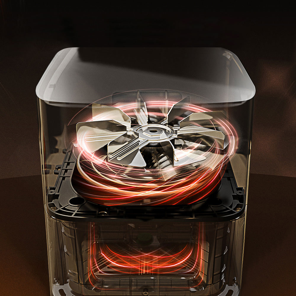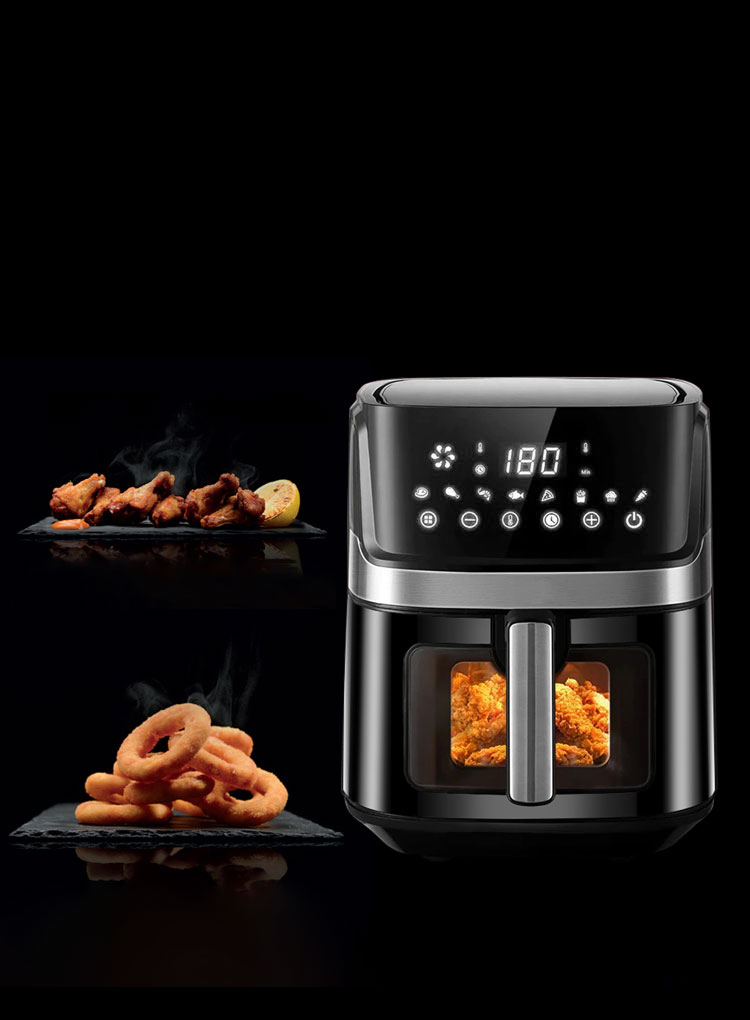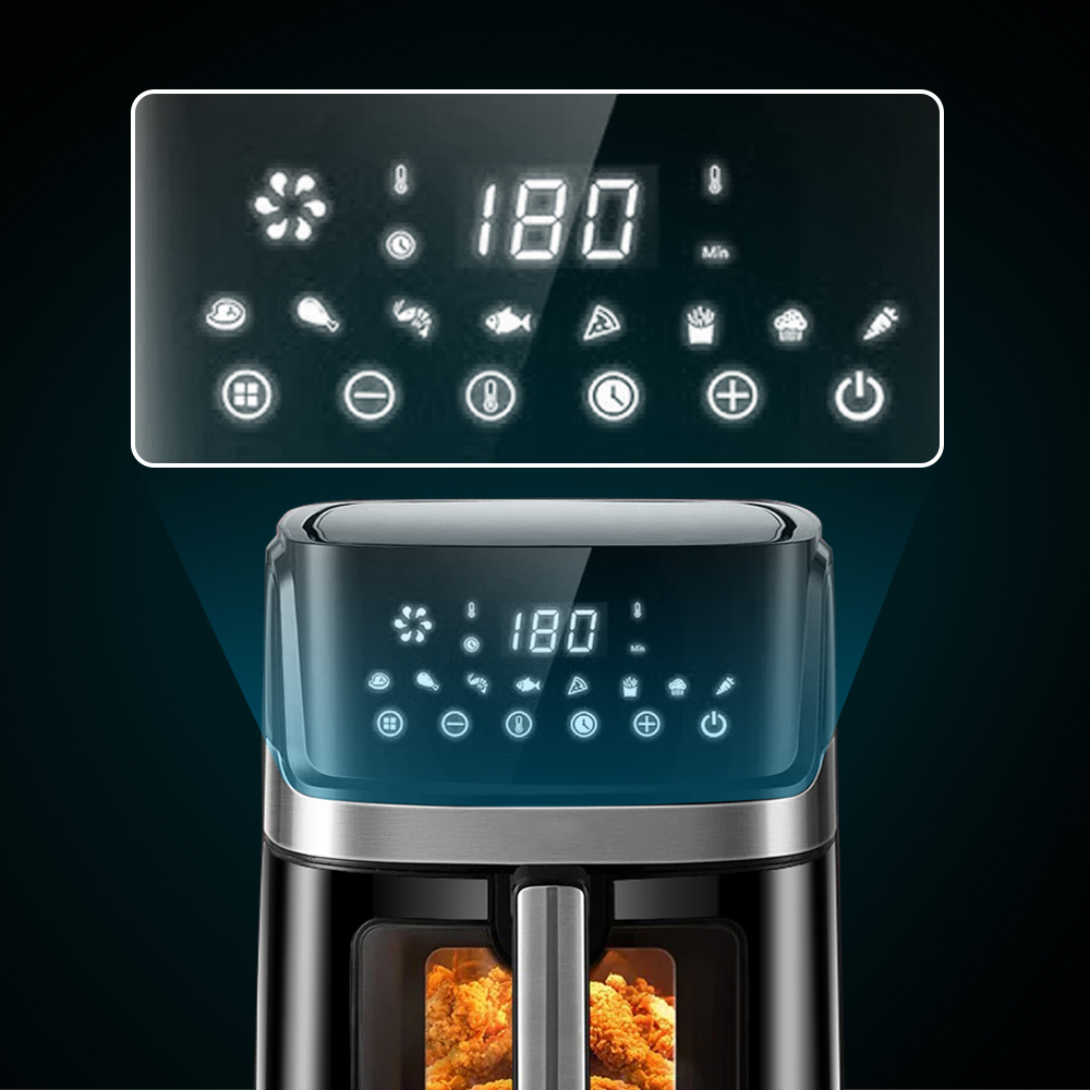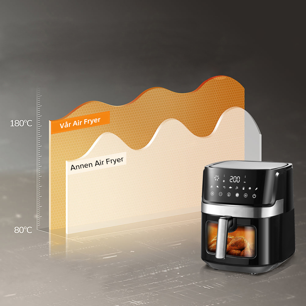 Airfryeren bruker 360° rask varmluftsirkulasjon for å sikre at ingrediensene dine raskt varmes opp fra alle retninger, herlig frityrstekt smak og sprø tekstur er laget uten fett og kalorier.