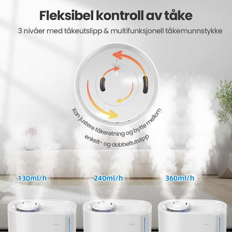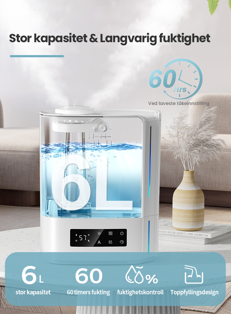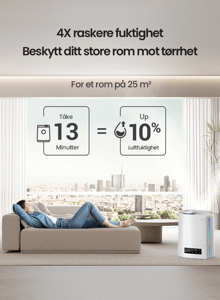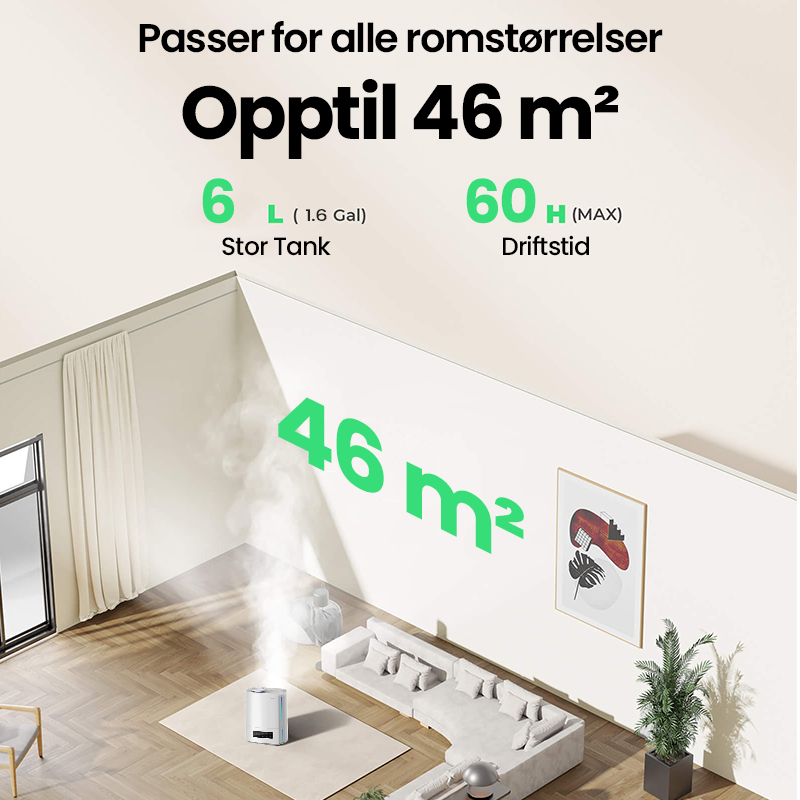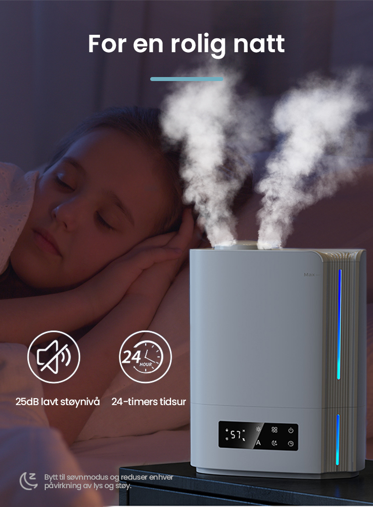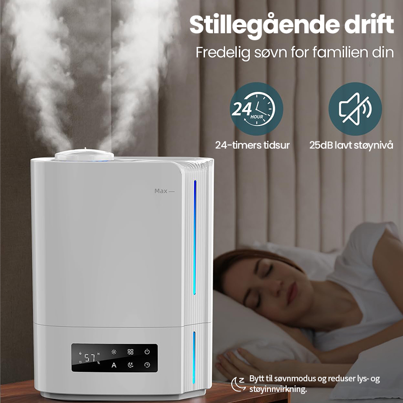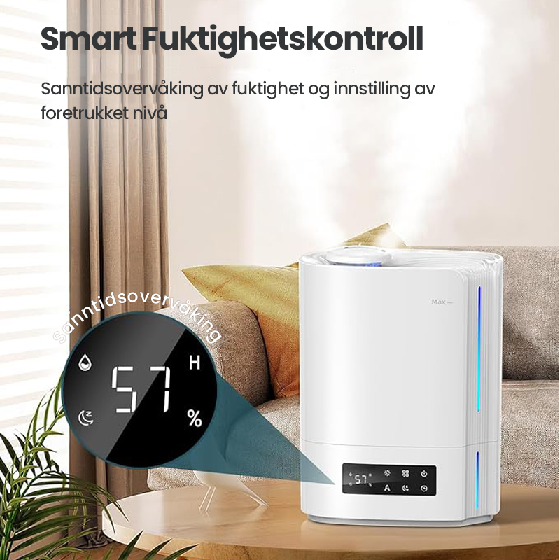 Automatisk intelligent drift med AI-algoritme, beregner med endringer i miljøfuktighet og temperatur, for dynamisk å justere tåkeutslippet automatisk for å opprettholde en ideell sunn fuktighet mellom 45 % og 60 %.