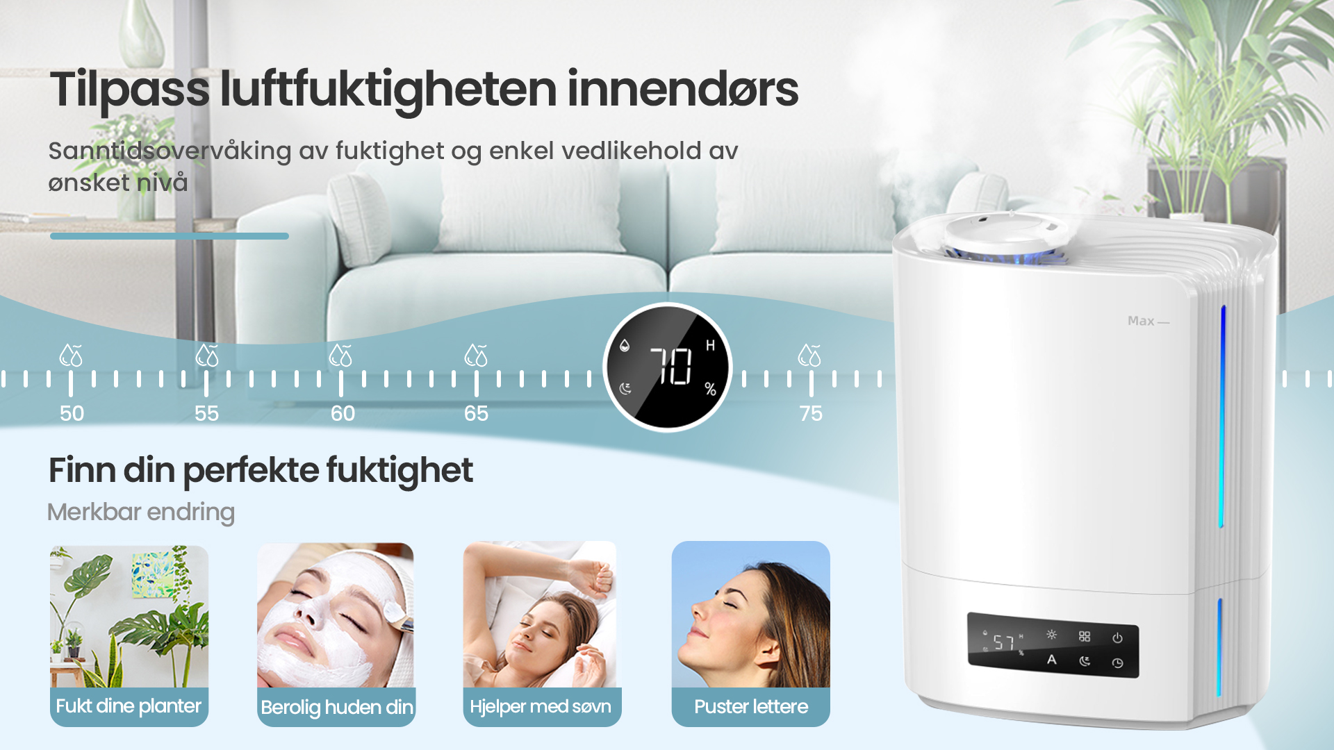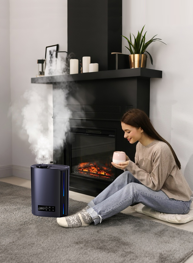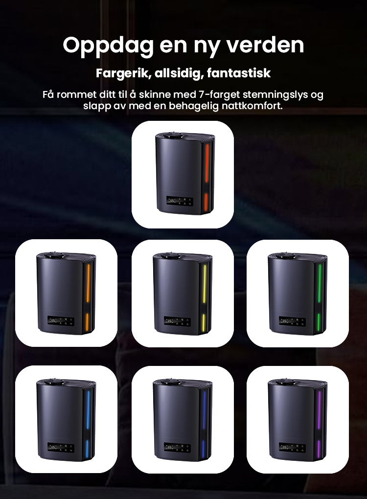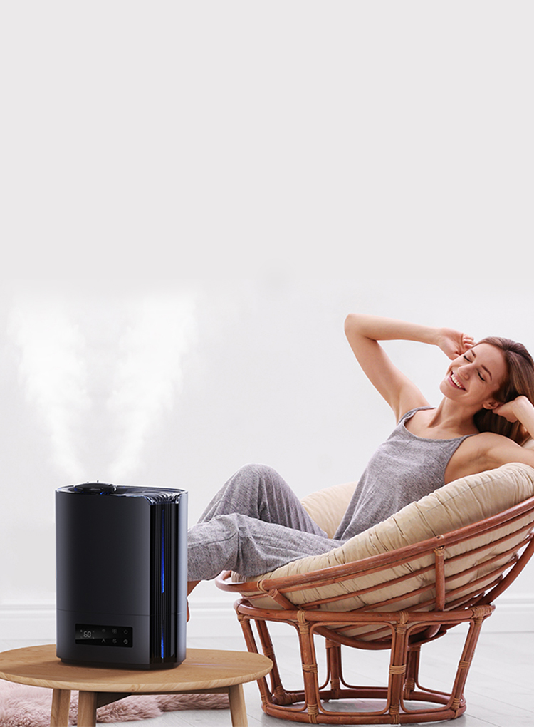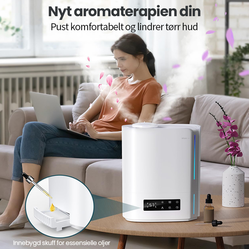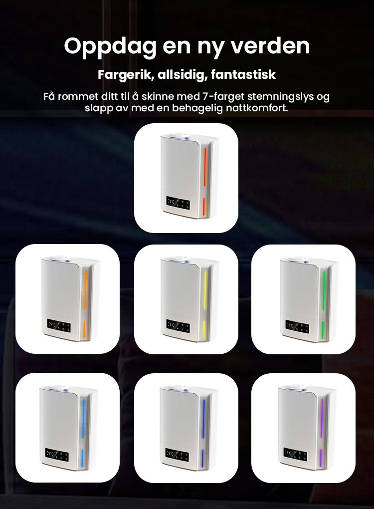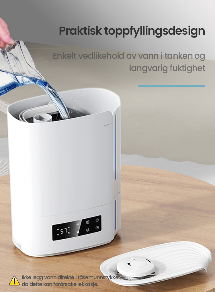 Automatisk intelligent drift med AI-algoritme, beregner med endringer i miljøfuktighet og temperatur, for dynamisk å justere tåkeutslippet automatisk for å opprettholde en ideell sunn fuktighet mellom 45 % og 60 %.