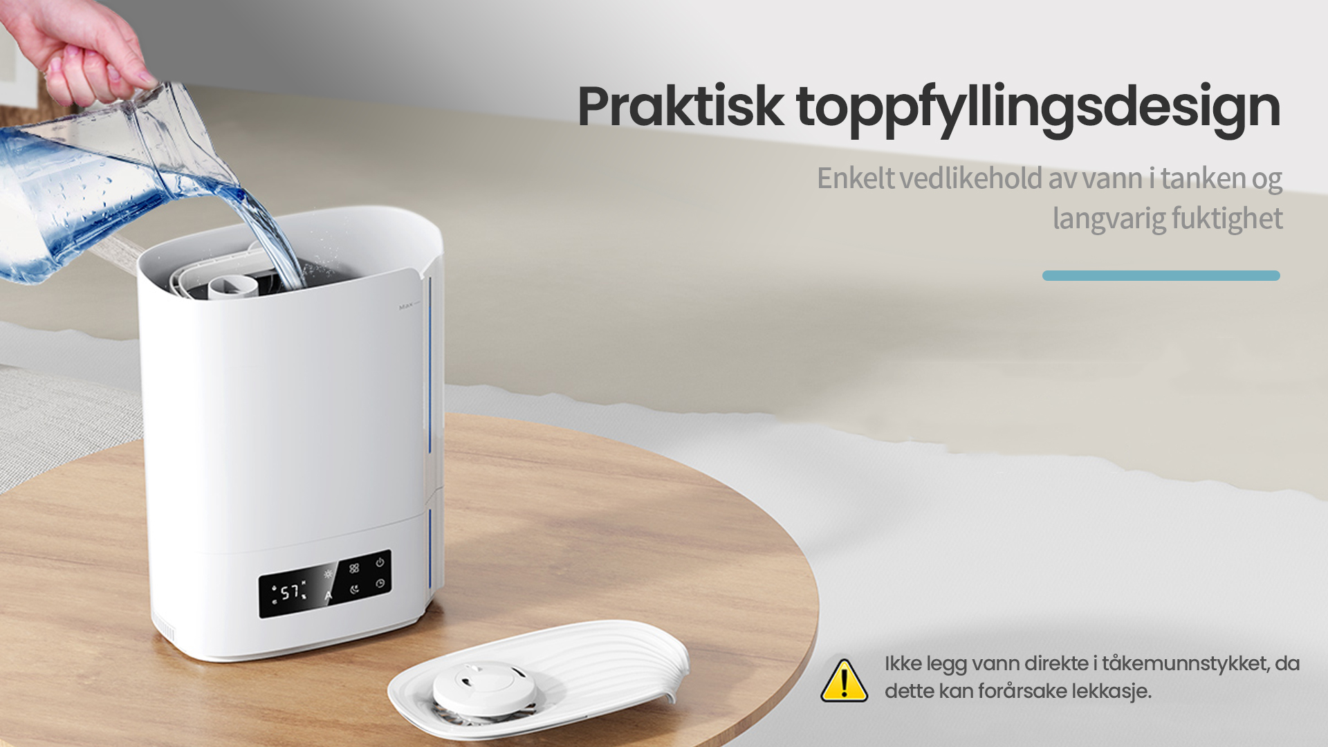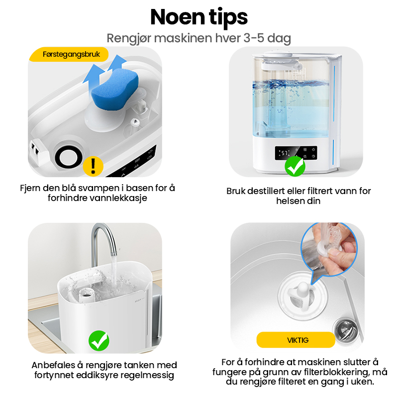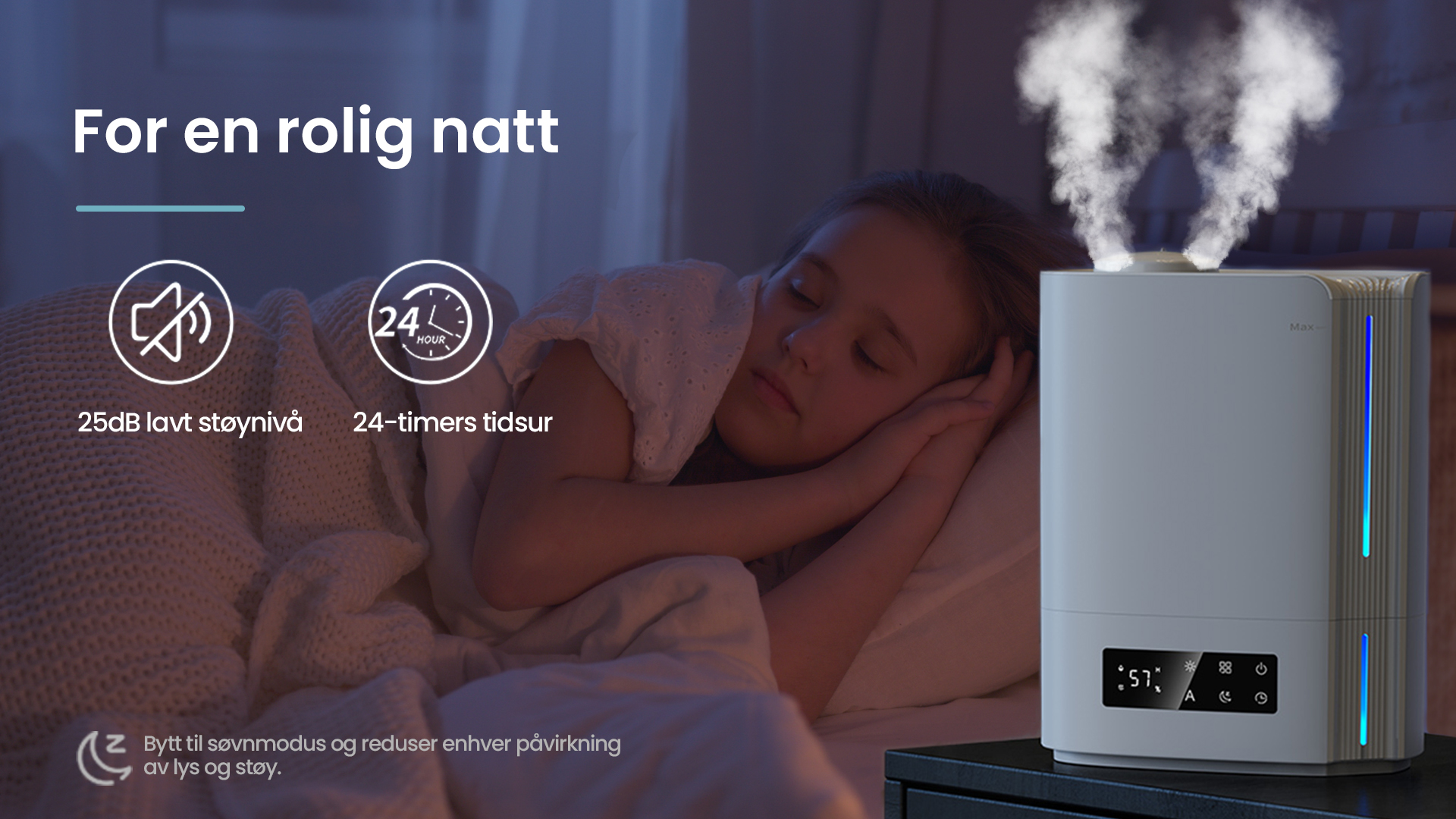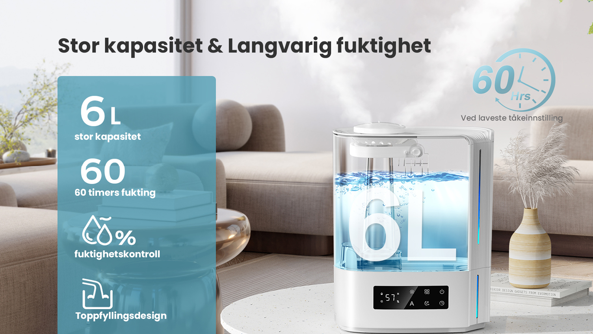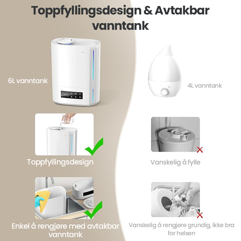 Automatisk intelligent drift med AI-algoritme, beregner med endringer i miljøfuktighet og temperatur, for dynamisk å justere tåkeutslippet automatisk for å opprettholde en ideell sunn fuktighet mellom 45 % og 60 %.
