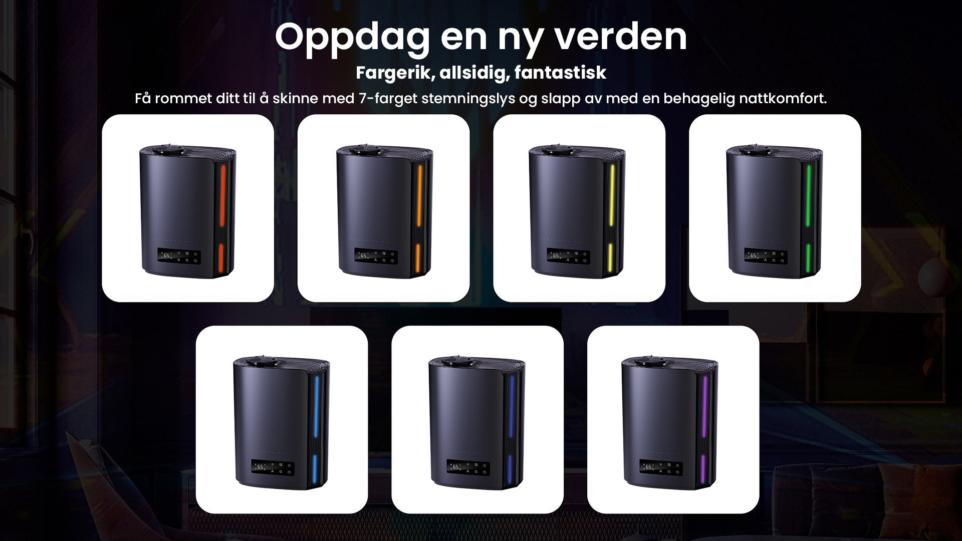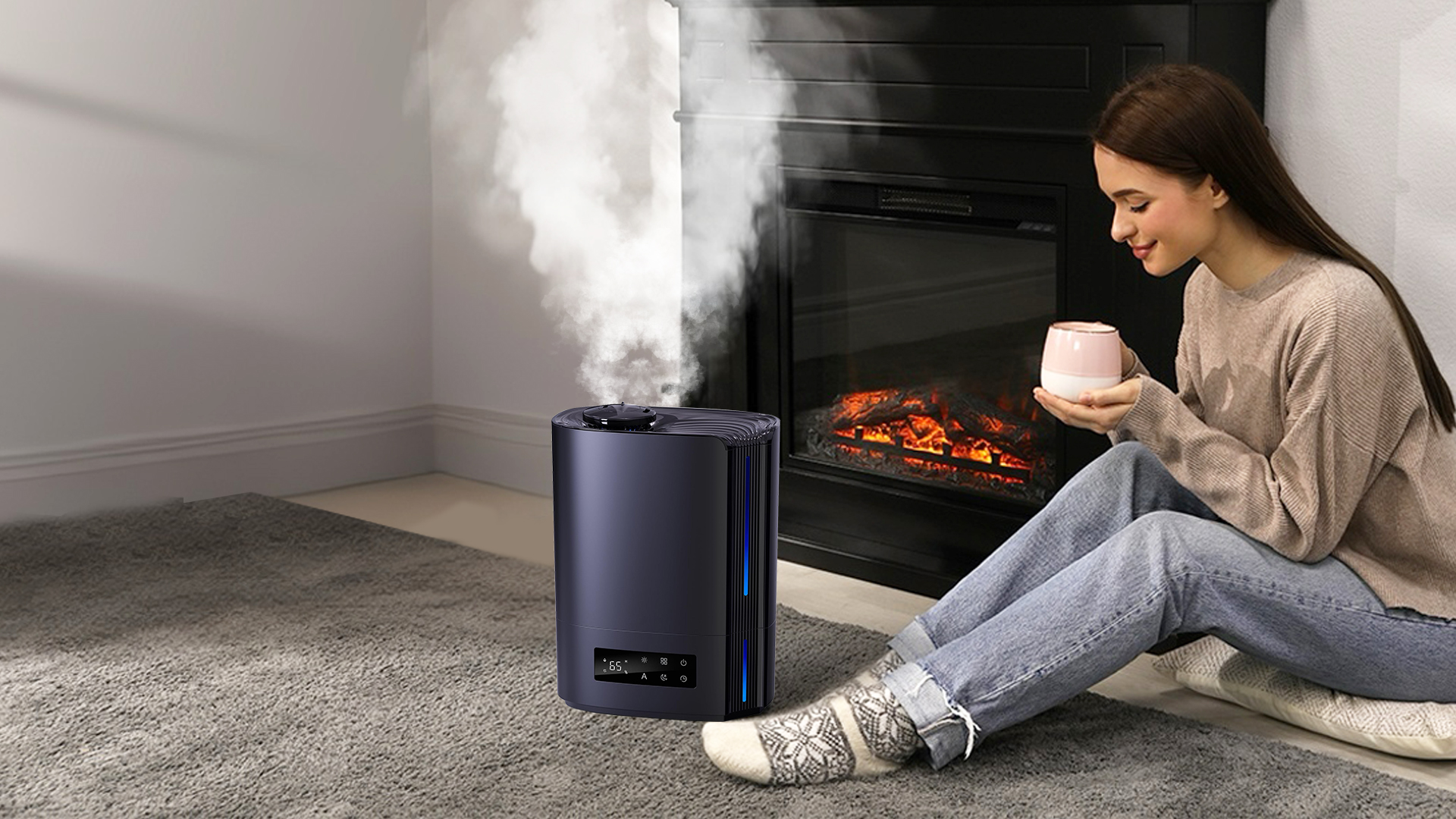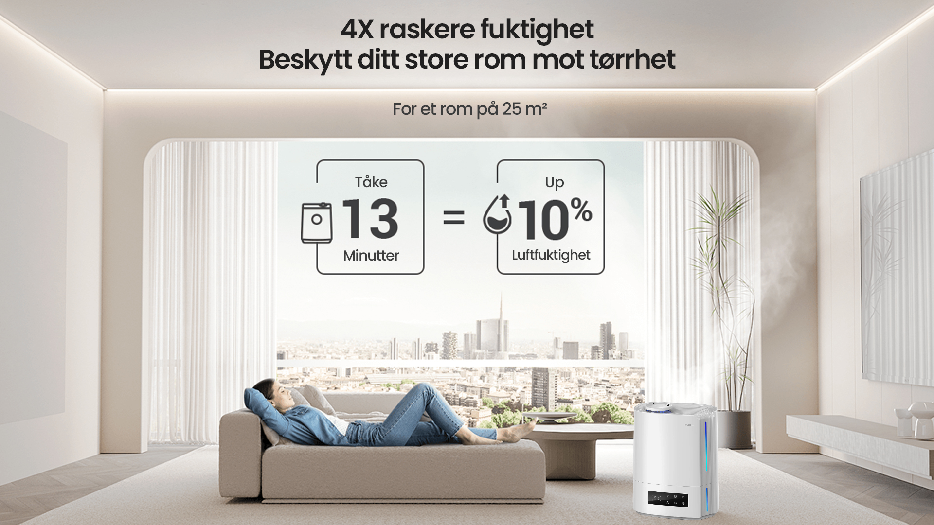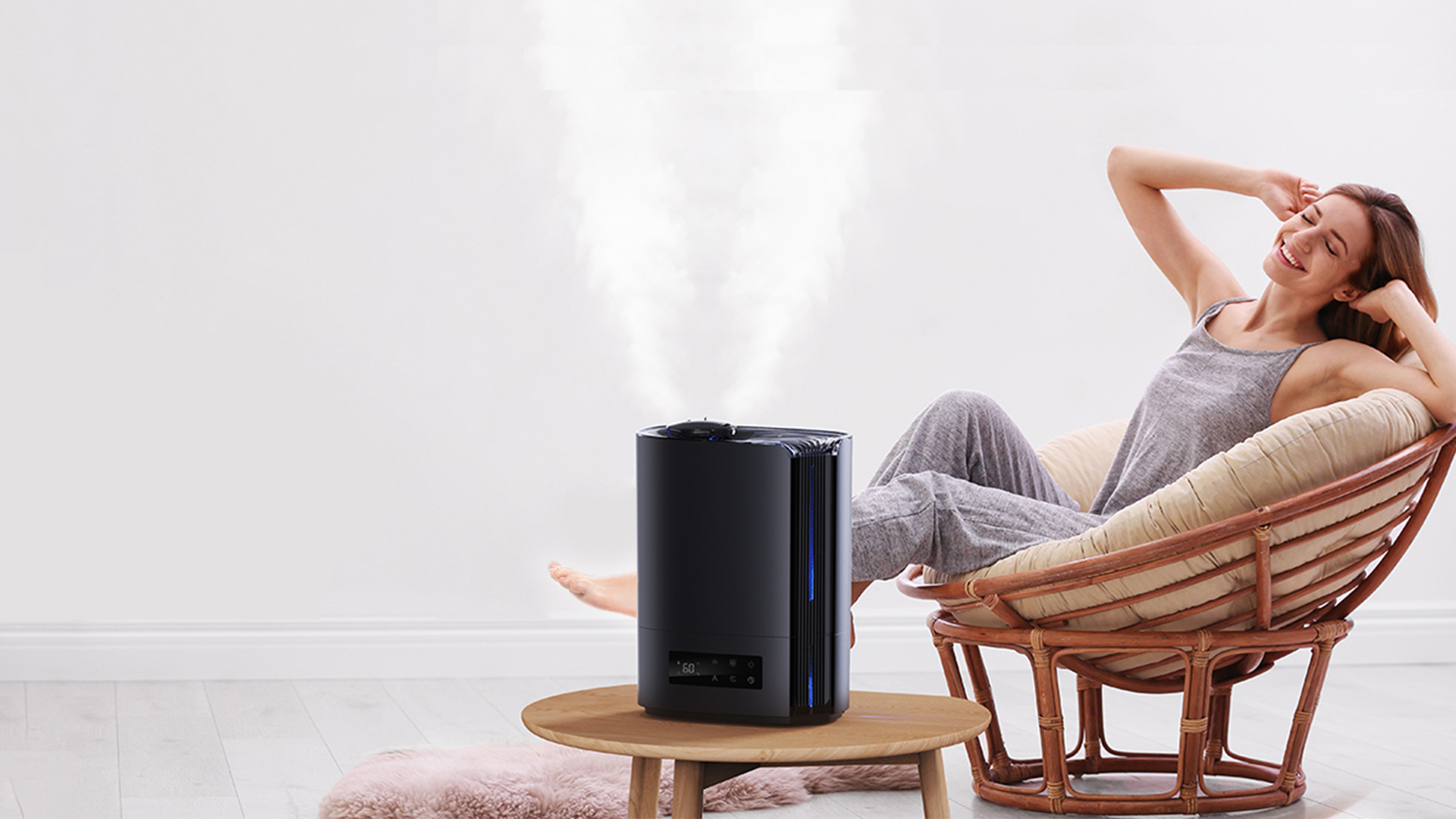 Automatisk intelligent drift med AI-algoritme, beregner med endringer i miljøfuktighet og temperatur, for dynamisk å justere tåkeutslippet automatisk for å opprettholde en ideell sunn fuktighet mellom 45 % og 60 %.