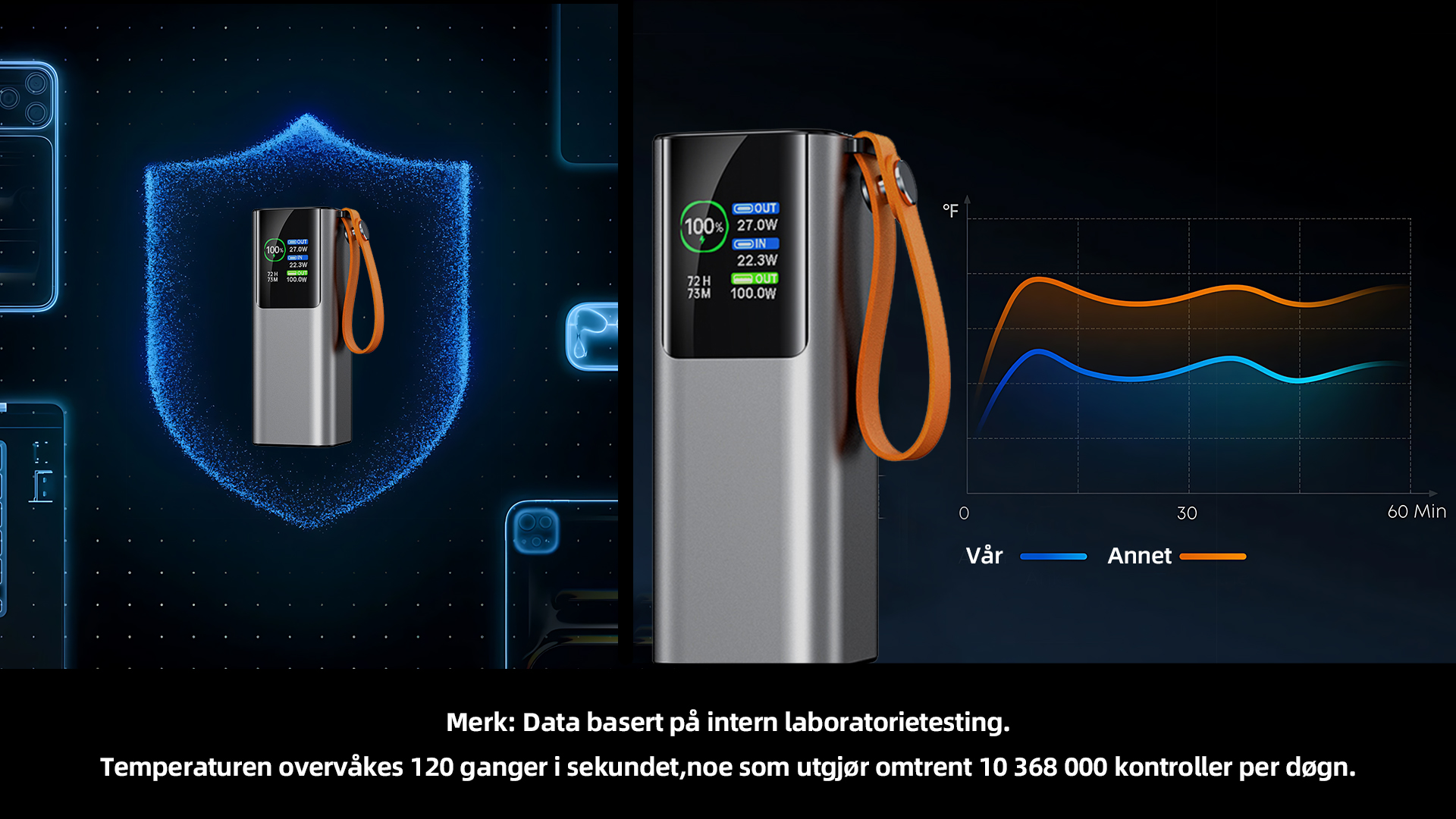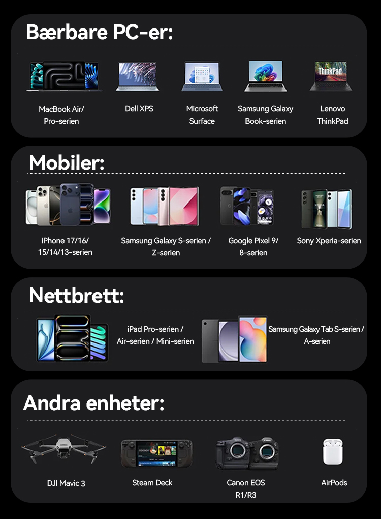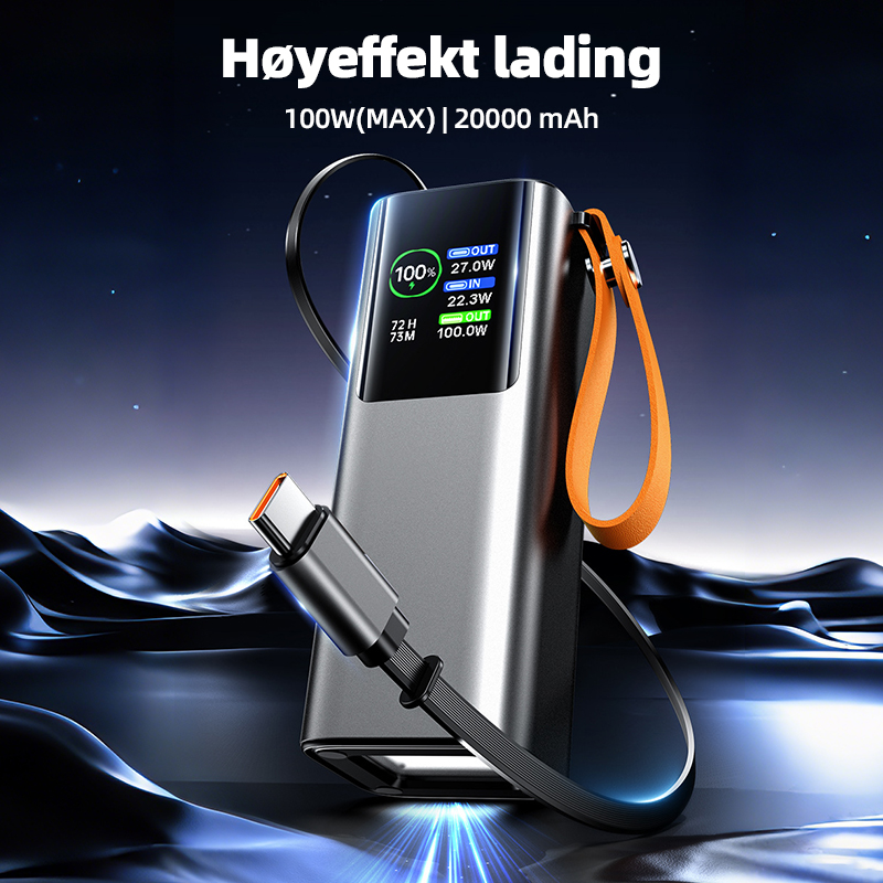 20 000 mAh-versjonen leverer opptil 100W maksimal utgangseffekt, noe som gjør den godt egnet til å lade bærbare PC-er, nettbrett og andre enheter med stabil og effektiv ytelse. Den er laget for jobb, reise og daglig bruk – og gir pålitelig strøm når du trenger det mest.
