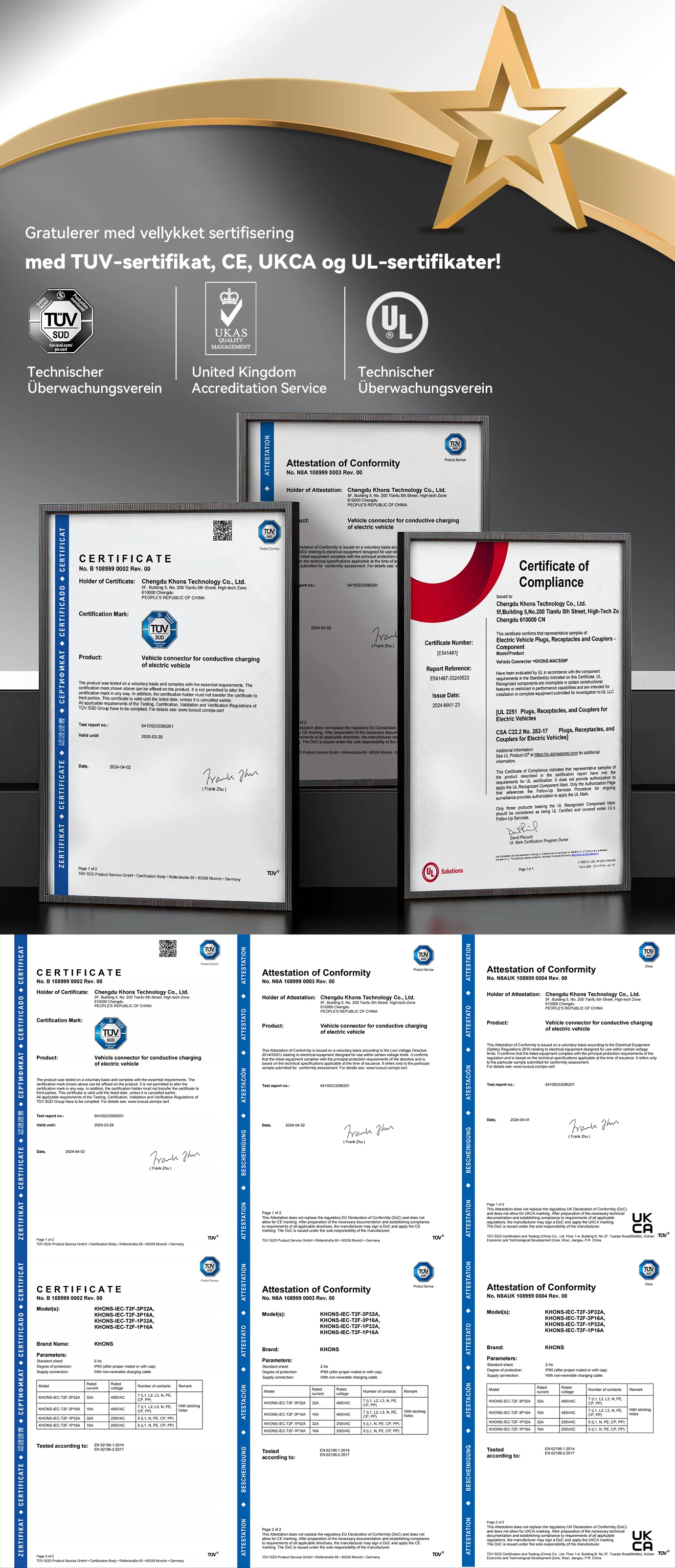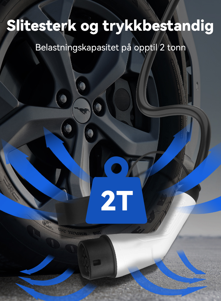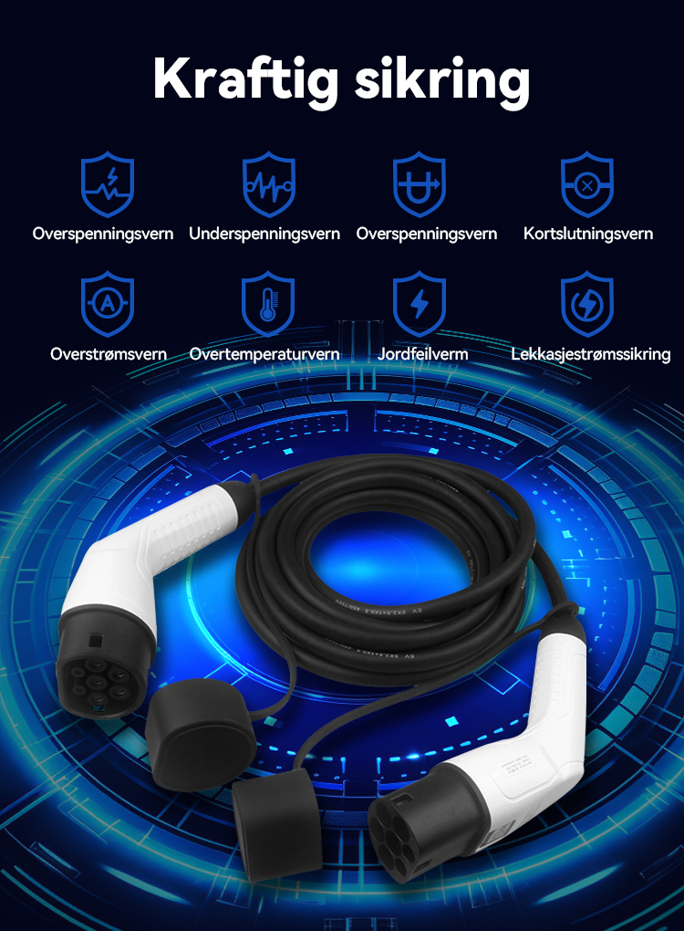 Denne ladekabelen for elbil er bygget med kobberledere av høy kvalitet, noe som sikrer effektiv strømoverføring og stabil ladeytelse. Kabelen har TPE-isolasjon med UL94 V-0 flammehemmende egenskaper, som gir økt fleksibilitet, høy slitestyrke og forbedret sikkerhet ved daglig bruk – både innendørs og utendørs.