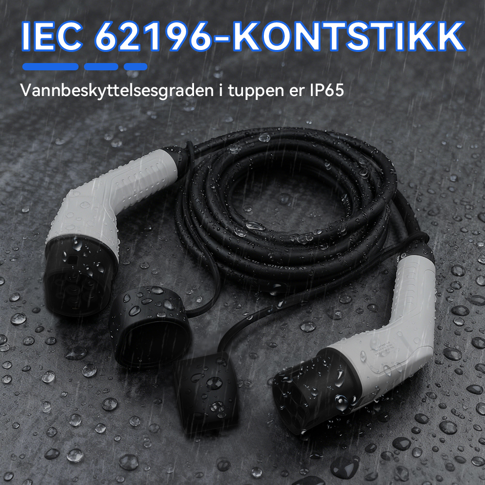 Denne ladekabelen er utstyrt med en standard IEC 62196 Type 2-plugg, som er utbredt i hele Europa for elbiler og offentlige AC-ladestasjoner. Kontakten er IP65-klassifisert, noe som gir beskyttelse mot støv og vannsprut. Dette gjør kabelen godt egnet for pålitelig utendørslading under vanlige europeiske værforhold.